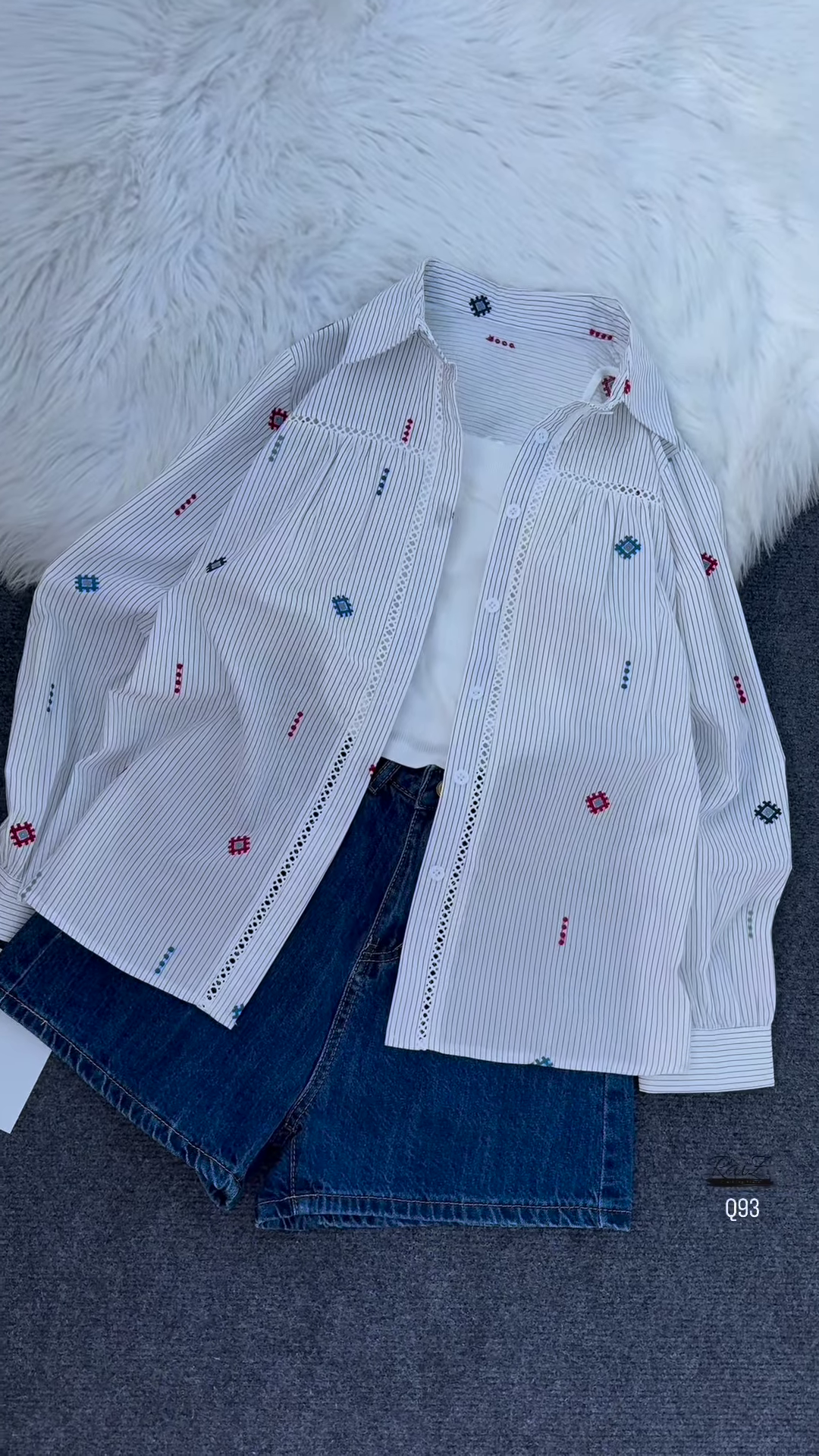 Freshen up your wardrobe with this Boho Chic Shirt and Shorts Set, a breezy combination of comfort and fashion. The white shirt features colorful geometric embroidery and delicate lace-style paneling, perfectly paired with classic blue denim shorts for a laid-back, sunny-day look.