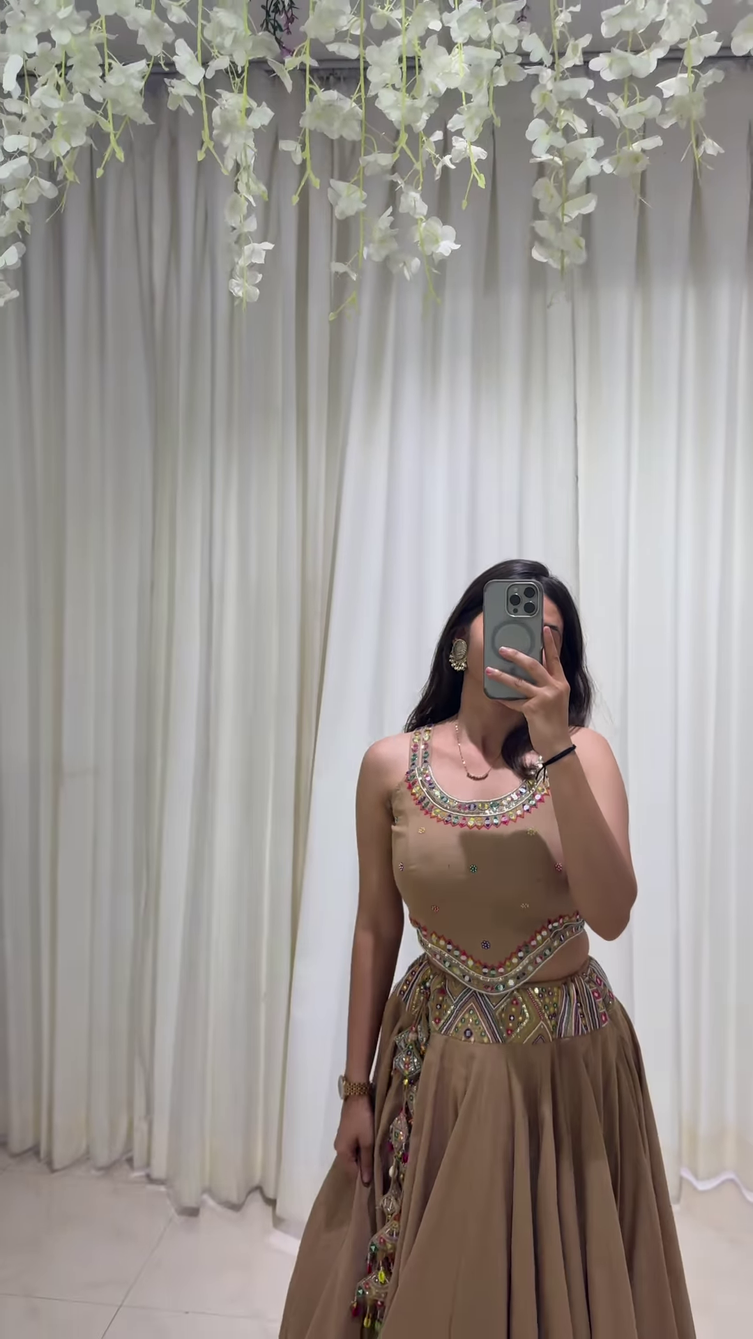 - Lehenga: A full-length flared brown lehenga with layered paneling that creates visual depth and graceful movement. The highlight is the embroidered waistline adorned with ornamental tassels that add traditional flavor and texture.