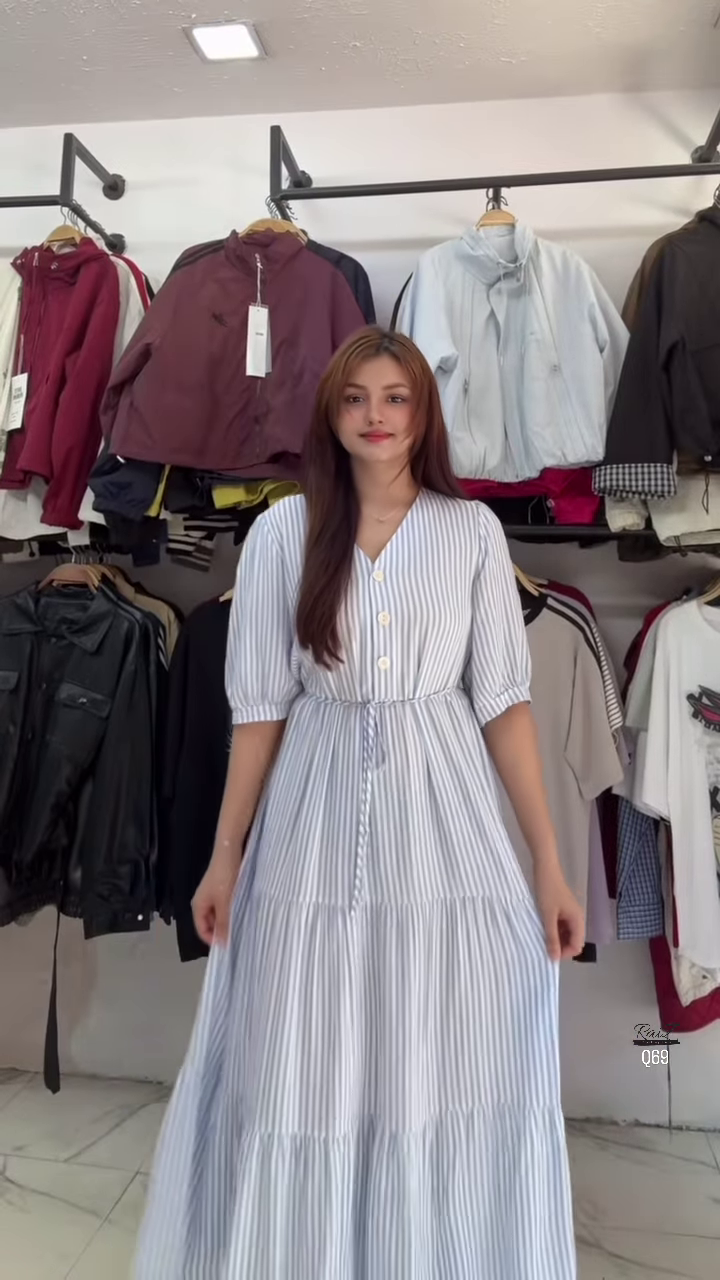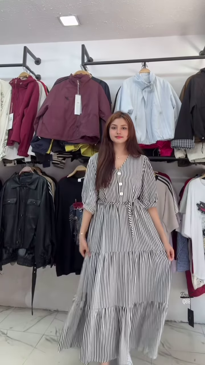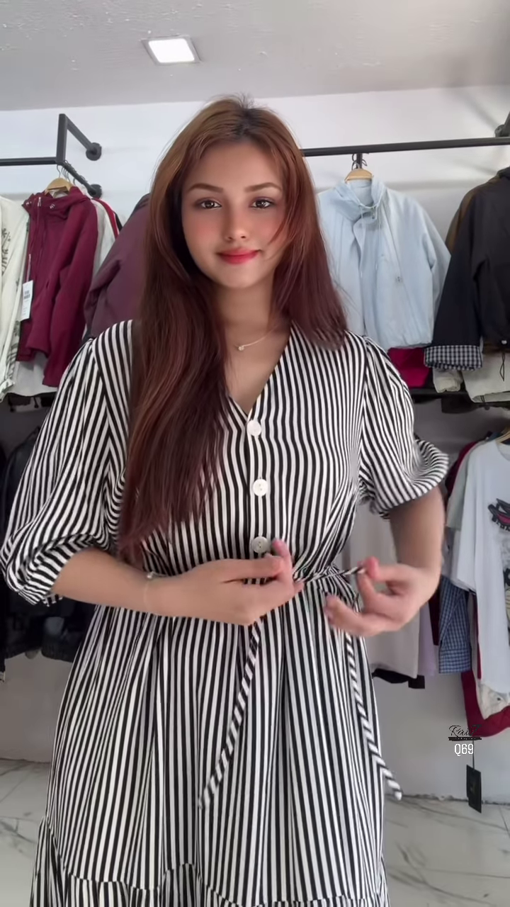 The skirt of the dress is designed with multiple horizontal tiers, adding volume and movement to the garment. The fabric appears to be lightweight and flowing, suggesting comfort and ease of wear. The model is standing in front of a clothing rack filled with other garments, indicating that this dress is likely part of a larger collection or available for purchase in this setting. The lighting is bright, ensuring that the details of the stripes and the tiered design are clearly visible. The overall style of the dress is elegant yet casual, making it suitable for a range of occasions, from daytime outings to more relaxed evening events. The black and white color palette is classic and timeless, ensuring that this dress remains a stylish choice for seasons to come.