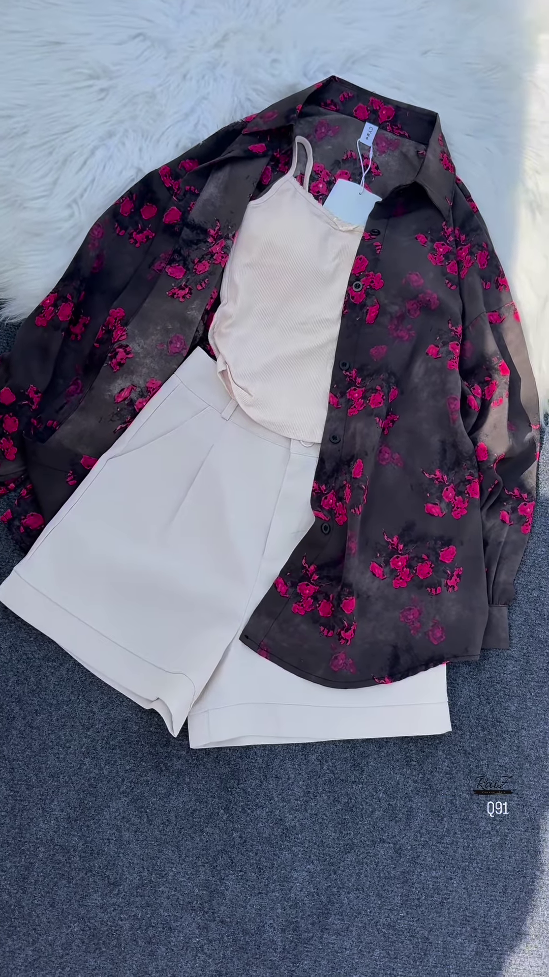 The combination of the dark floral overshirt, the light tank top, and the tailored shorts creates a balanced and fashionable look that blends casual and sophisticated elements. The soft, textured background enhances the visual appeal of the clothing, making it the clear focus of the image. The lighting is even, highlighting the details and textures of each garment. This outfit would be versatile for various occasions, easily dressed up or down depending on accessories.