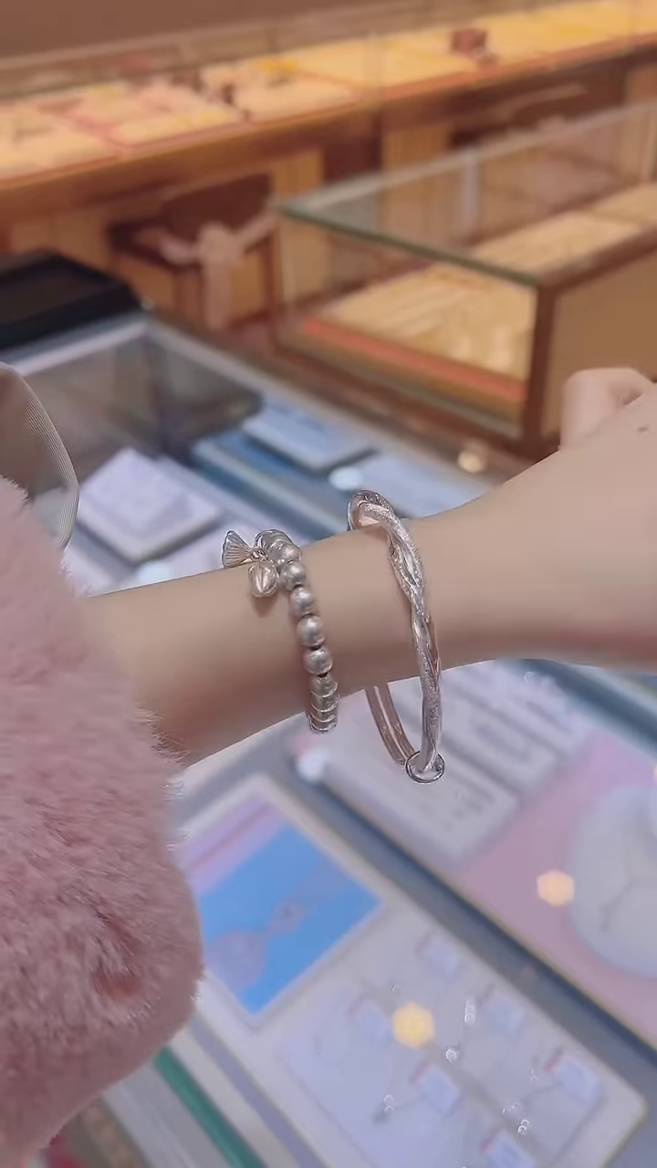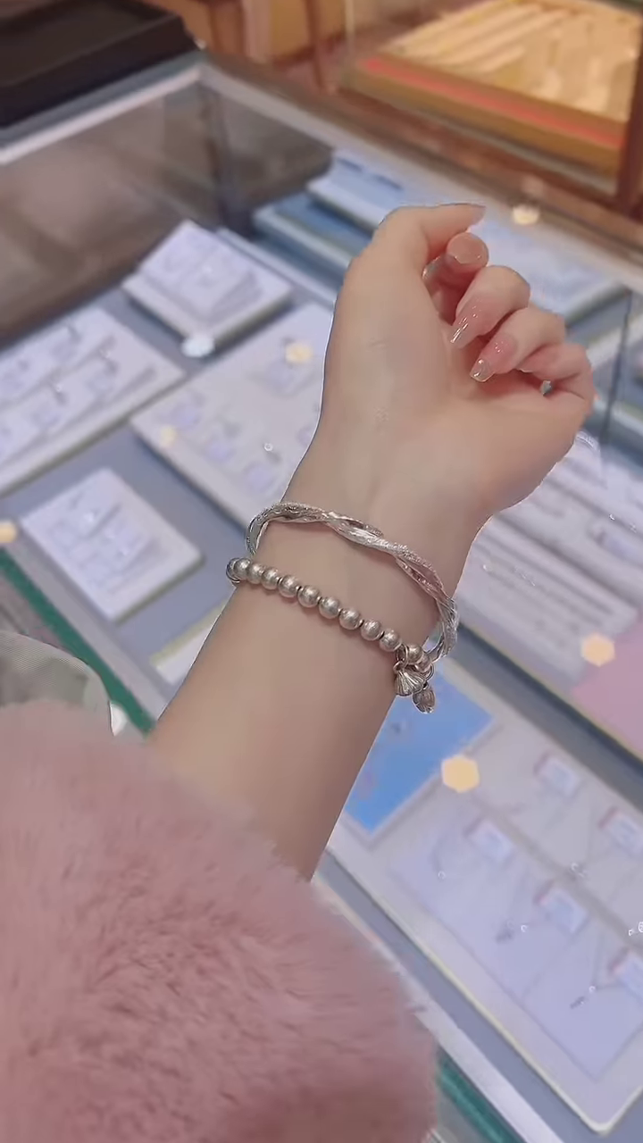 The second bracelet complements the first with a delicate beaded design. It likely consists of small, smooth sterling silver beads strung together, creating a classic and understated look. The simplicity of the beads provides a lovely contrast to the textured bracelet, adding balance to the layered set. A small charm, possibly a floral or abstract design, may dangle from this beaded bracelet, adding a touch of delicate detail and movement.