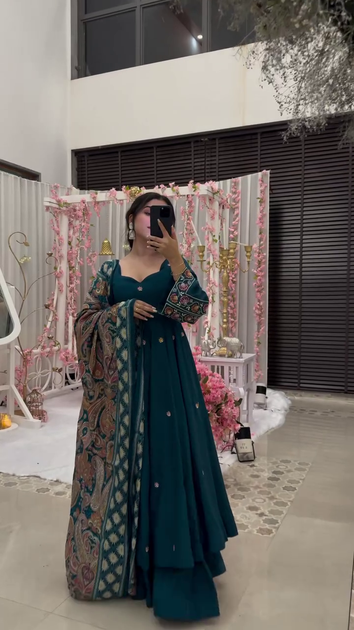 Green Skirt GGreenish Blue Chinon Silk with Embroidery Work Kurti seteorgette Bralette Raw Silk Cape Organza Set With Puff Sleeve (Copy)