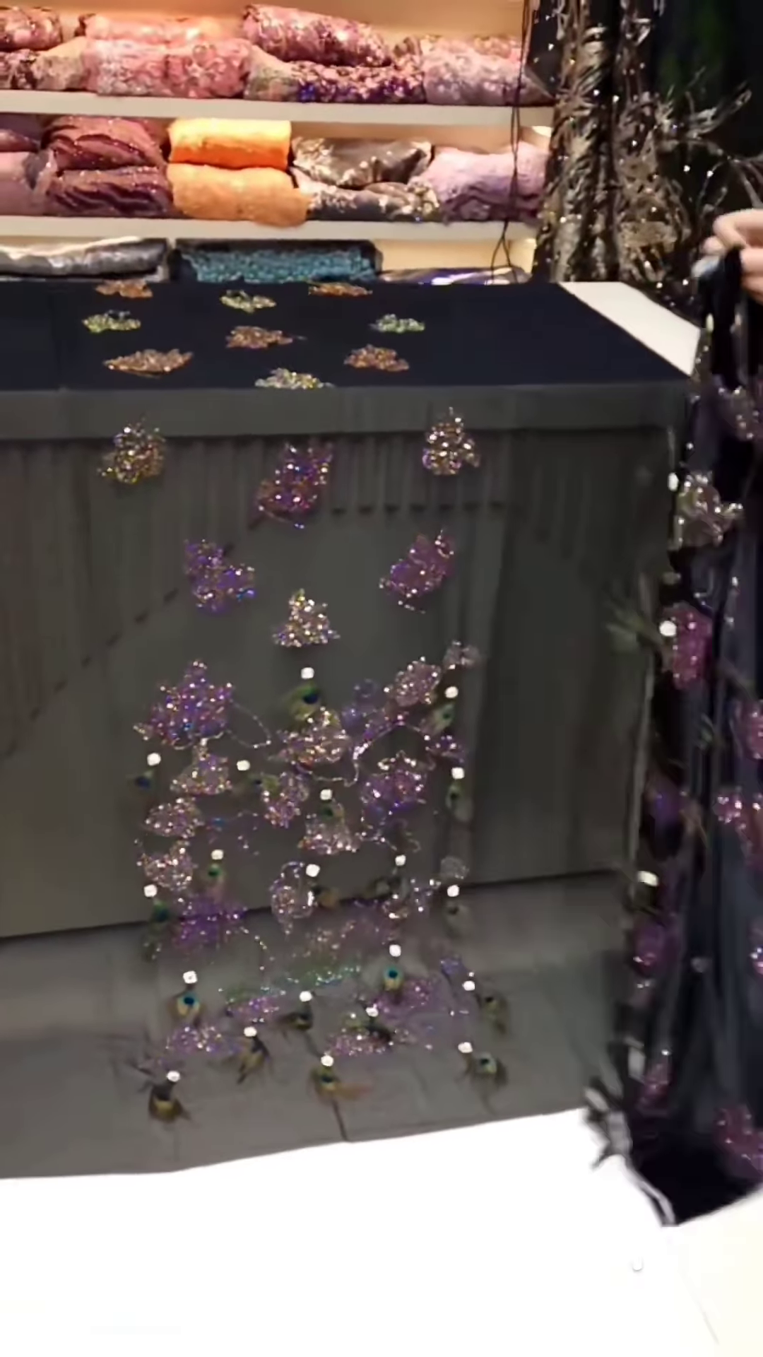 Merchandising suggestions include showcasing this fabric in roll folds with ambient lighting to emphasize shimmer or hanging swatches against dark solid backdrops to make the colors pop. The tactile element—soft yet structured—makes it appealing for garment designers and boutique tailors who focus on premium craft with retail realism.