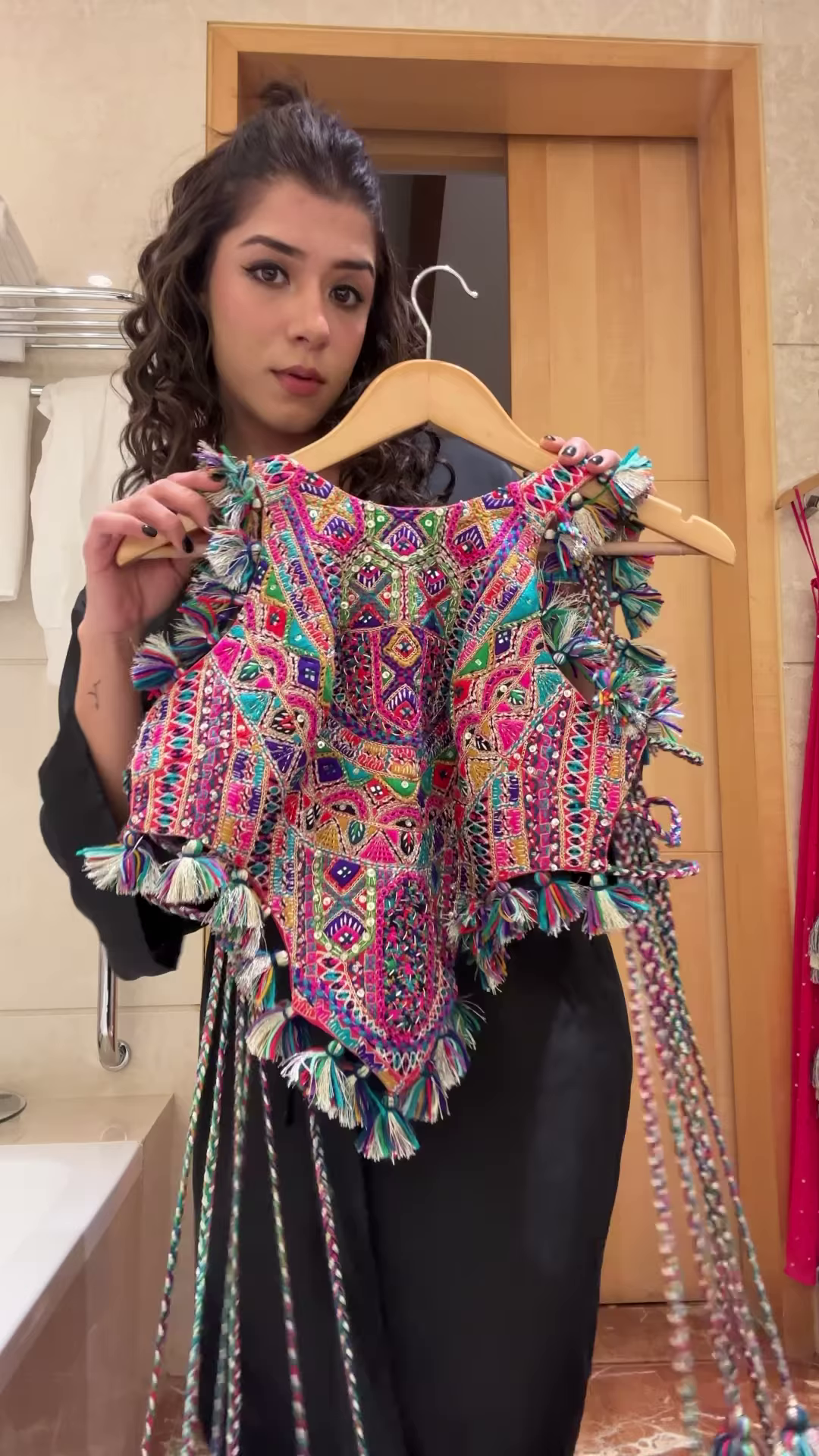The outfit features a heavily embroidered sleeveless crop top with intricate mirror work, vivid multicolor thread embroidery, and tribal motifs. Crafted on a rich base fabric, the top showcases tassel detailing along the hemline and armholes for a playful, flared finish. Each mirror catches the light beautifully, making it ideal for festive evenings and stage-ready looks. The sleeveless design and structured cut enhance the upper body while keeping you cool during energetic dance Complementing the top is a bold hot pink sharara pant — flared, floor-length, and flowy. Designed for comfort and movement, the pants feature small dotted mirror embellishments scattered throughout, paired with vertical tassel lines that add height and visual drama. The fabric drapes softly around the legs and flows with each step, perfect for twirling during Garba or Dandiya nights.