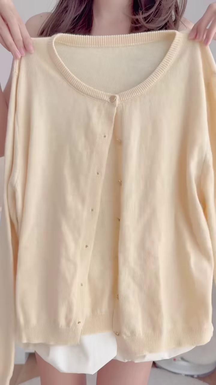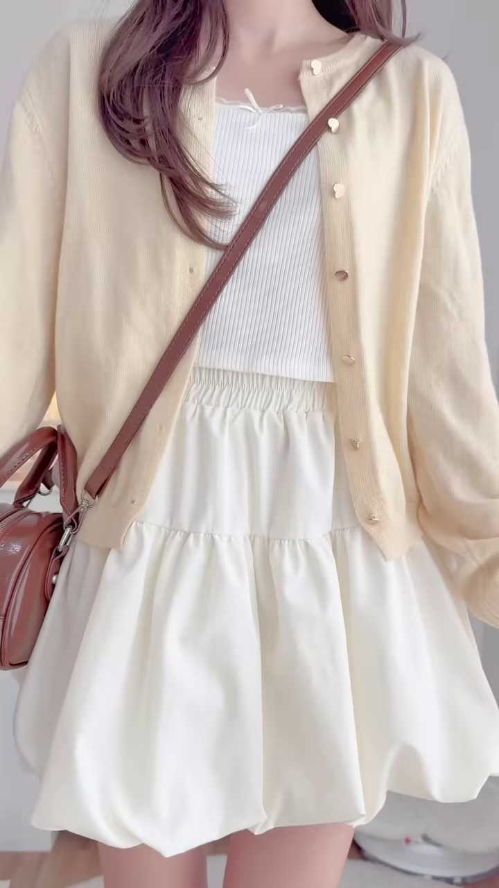 • 🟣 Light Purple: Ribbed cardigan with five bow-shaped buttons + embroidered heart with “R” detail