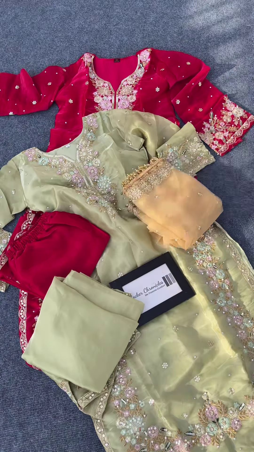 The kurti is made from a lightweight, semi-sheer georgette or chiffon-style fabric that offers both fluidity and comfort. It falls effortlessly on the body, making it a flattering choice for all body types. The short sleeves are finished with matching embroidery and scalloped edges, adding extra detail that ties the entire ensemble together. The body of the kurti is sprinkled with small floral sequins and delicate buti work, giving it a regal yet wearable finish.