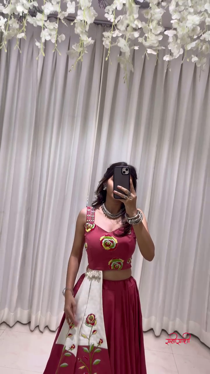 - Lehenga & Choli: Deep Red with Floral Embellishments