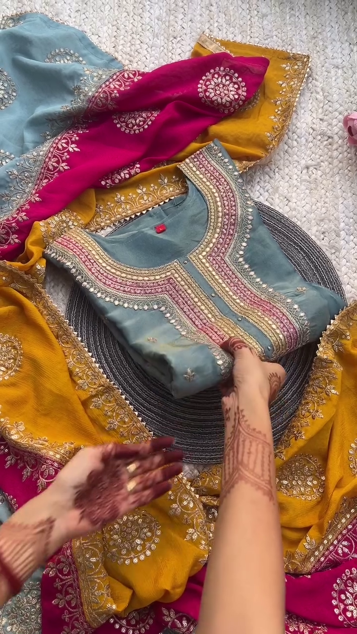 Step into elegance with this exquisite traditional kurta set, crafted for festive occasions and celebrations. Designed with intricate embroidery, mirror work, and a vibrant color palette, this outfit exudes timeless charm and regal sophistication. The detailed craftsmanship and luxurious fabric make it a must-have for any special event, ensuring you stand out with grace and style.