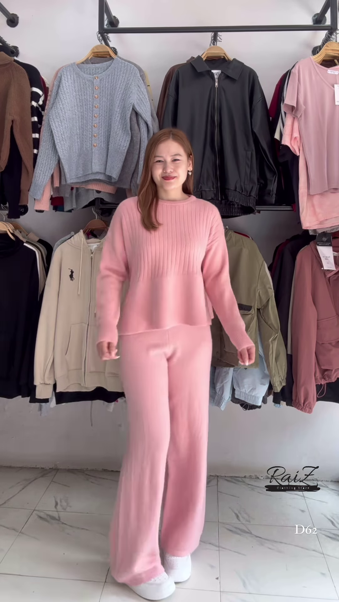 - 🟣 Light Purple: Soft pastel knit with relaxed sweater and matching pants + styled with gentle drape