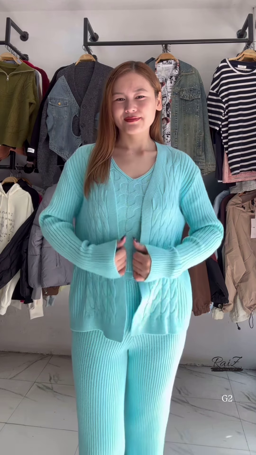 - 🔷 Light Blue: Ribbed knit cardigan + V-neck sweater + matching pants with cable detailing