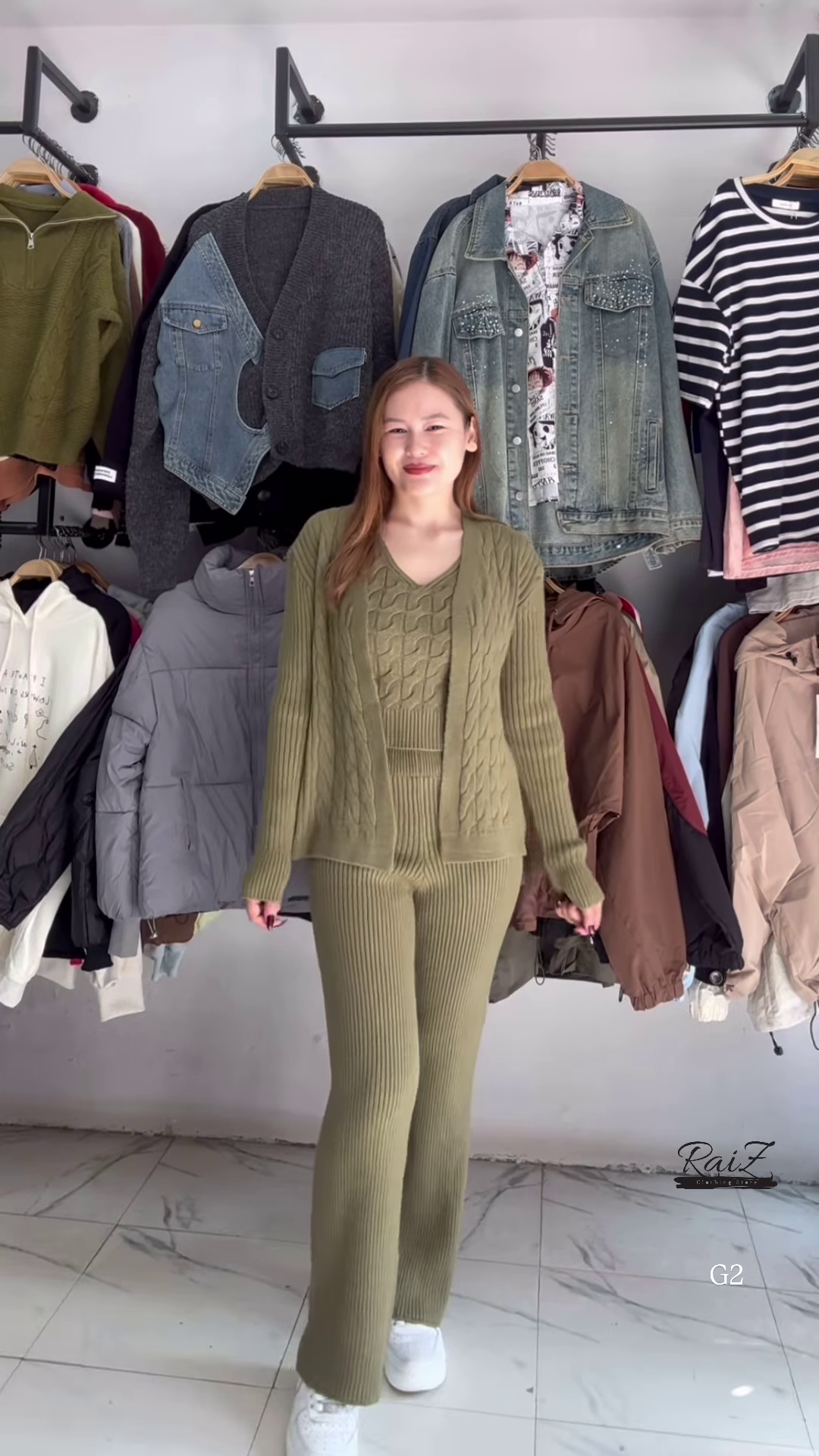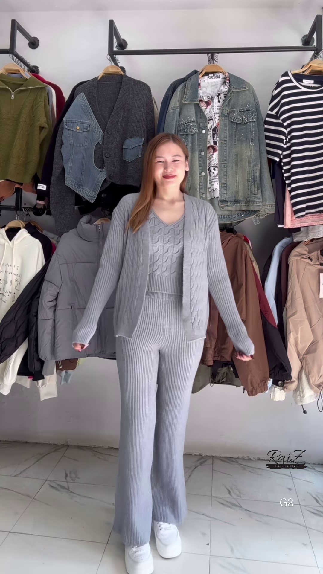 - 🌫 Grey: Coordinated cardigan, V-neck sweater, and flared pants in soft grey knit