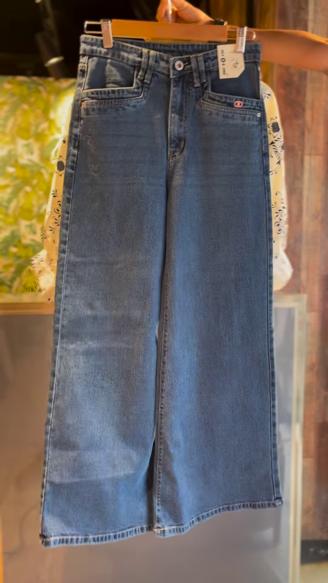 Paired seamlessly, the dark blue denim jeans provide a timeless foundation. With a high-rise fit and standard straight-leg cut, they balance out the vibrant top and anchor the outfit with everyday practicality. The jeans are plain, pocketed, and tailored for comfort—making the look easy to wear from day to night.