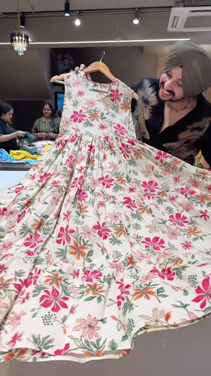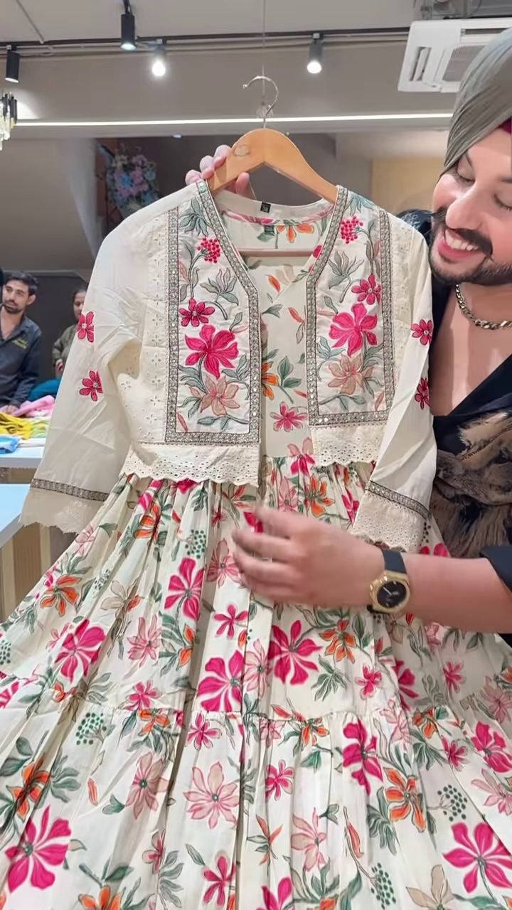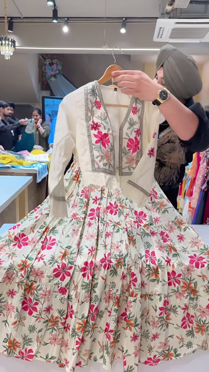 Make a bold festive statement with this cream-colored Anarkali-style dress featuring multicolor floral embroidery and a voluminous flared hem. Crafted for ethnic fusion edits, boutique catalog features, or celebratory carousel drops, the ensemble blends traditional craftsmanship with striking color play and structured elegance.