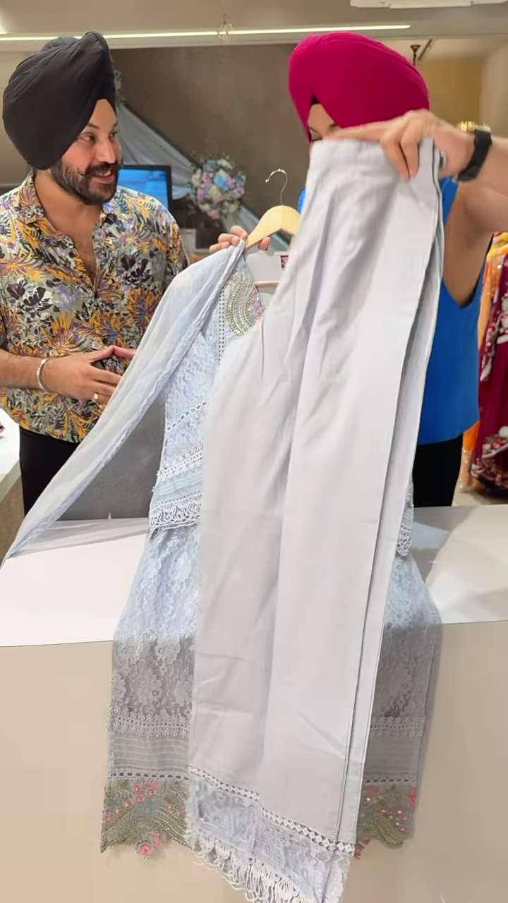 Style suggestions include pairing this set with oxidized earrings, pastel block heels, or pearl-studded juttis. A soft bun hairstyle and nude-toned makeup can round off the look for daytime festivities or boutique try-on sessions.