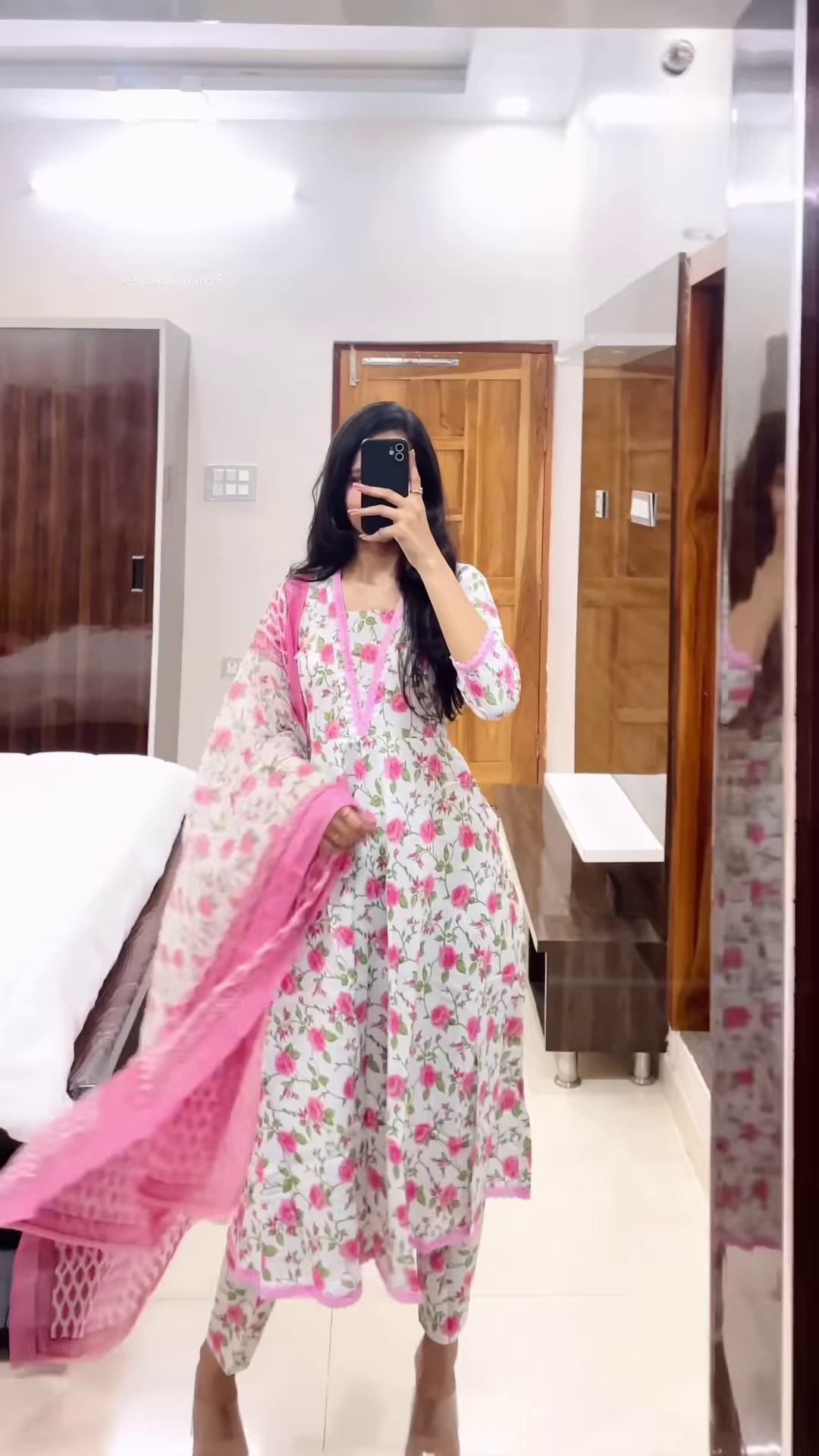 Captured in a mirror selfie for authenticity and relatability, the image provides realistic fit references for catalog thumbnails, haul reels, or online listings. The handheld phone and indoor backdrop contribute to lifestyle-driven presentation, making it ideal for WhatsApp carousel series or influencer-curated edits.